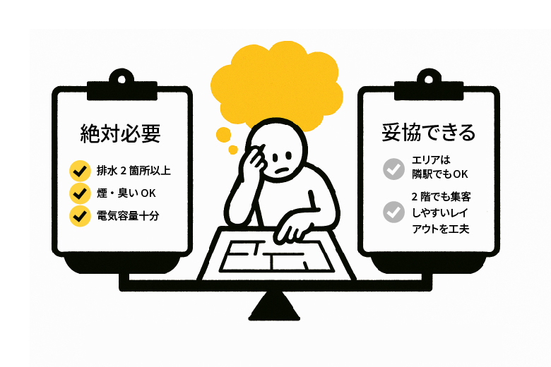 「希望エリア/賃料/広さ/1階路面」…理想が高すぎて、なかなか物件が見つからない方もいらっしゃいます。そんなときは、絶対に譲れない条件と、緩めてもいい条件を明確に分けておくのがコツ。