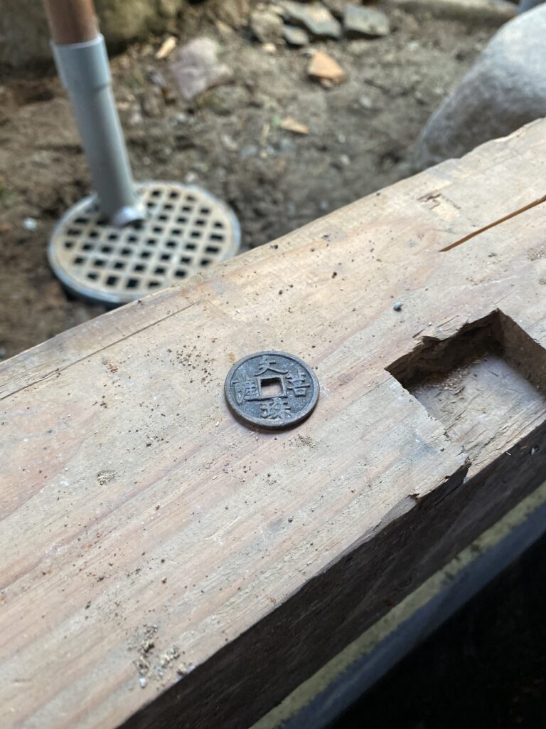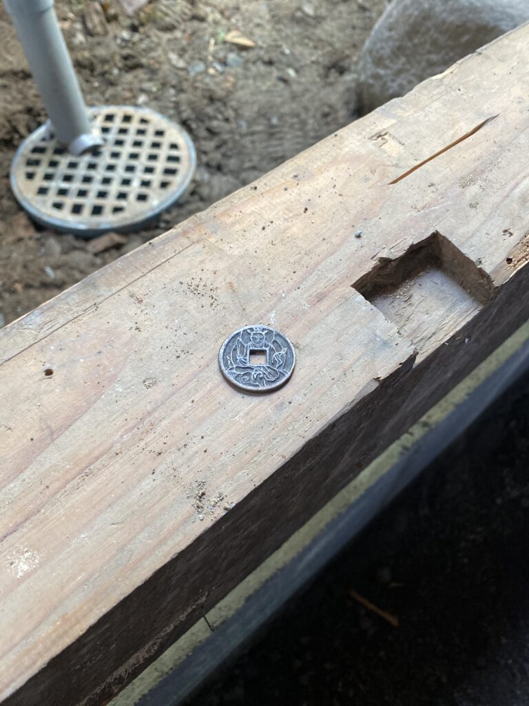 ある朝、おはよーございます。と現場に行くと、なにやら古びた硬貨が片隅においてありまして…左官屋さんによると、土間打設準備のために土を掘り返していたらでてきたみたい。よく見ると「文殊菩薩」と刻まれていて、菩薩の絵もかいてあります。