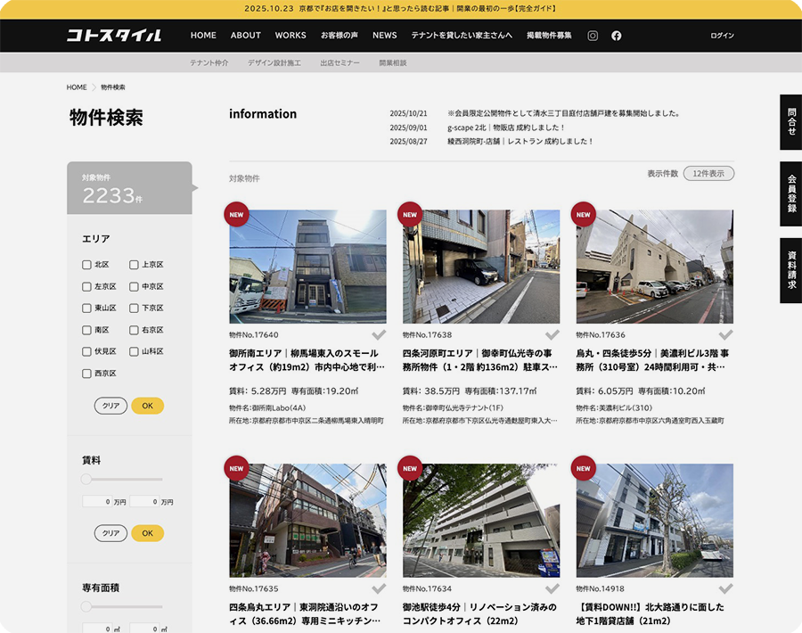 さらに、コトスタイルでは「Webには載せていない非公開物件」や、「これから募集予定の物件」も取り扱っています。これは私たちが京都の地元不動産や大家さんとのネットワークを持ち、“設計施工まで一括で任せられる安心感”から、まず最初に物件情報が集まりやすい構造になっているからこそ。