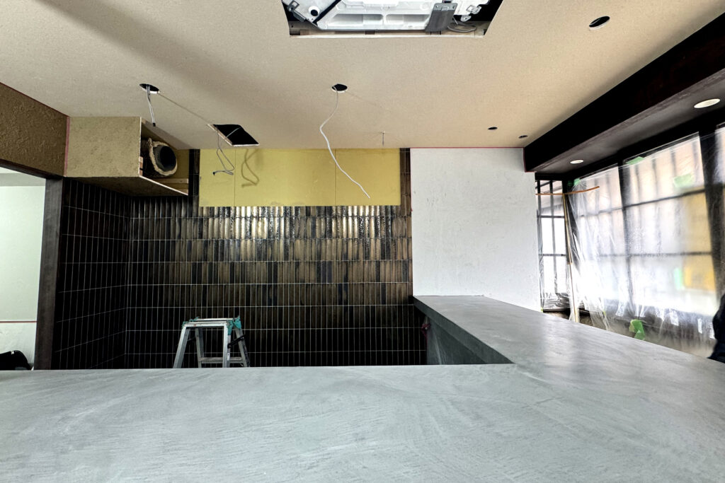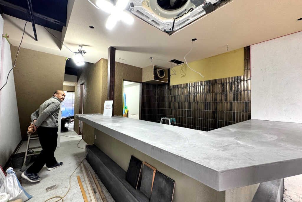 カウンターと左官作業の様子