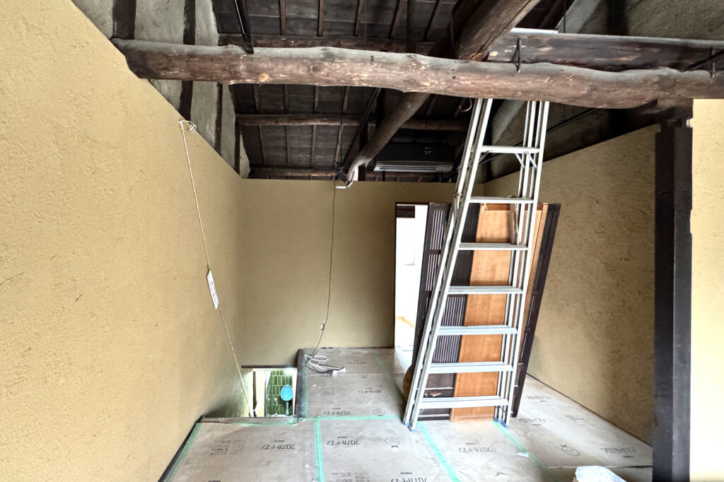 2階に上がると、天井を支える太い梁がそのまま残されていました。年月を重ねた木の黒と、塗りたての壁の新しい色。古いものと新しいものが混ざり合う光景に、思わず見入ってしまいます。