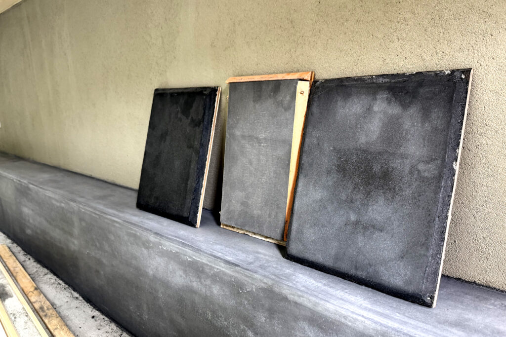床は墨モルタル仕上げの予定。カウンターの下に3枚の色味サンプルが並んでいました。「どれにするか、ナガサワさんがまだ悩んでるんですよ」と左官屋さん。色の濃さを少し変えるだけで、全体の雰囲気がまるで違う。設計図では決められない部分を、こうして職人さんが現場で確かめながら進めてくれる。そうした信頼関係が、コトスタイルの現場を支えています。