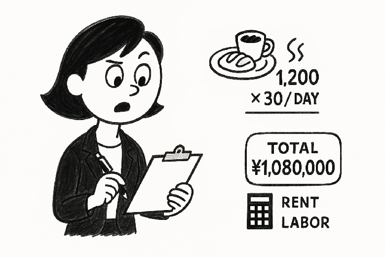 たとえば、ランチ営業のカフェで客単価1,200円、1日30人来るとして、月商は約108万円。それに対して、家賃、人件費、原材料、広告、そして返済をどう配分していくか ── ここを無理なくシミュレーションできるかどうかがカギ。