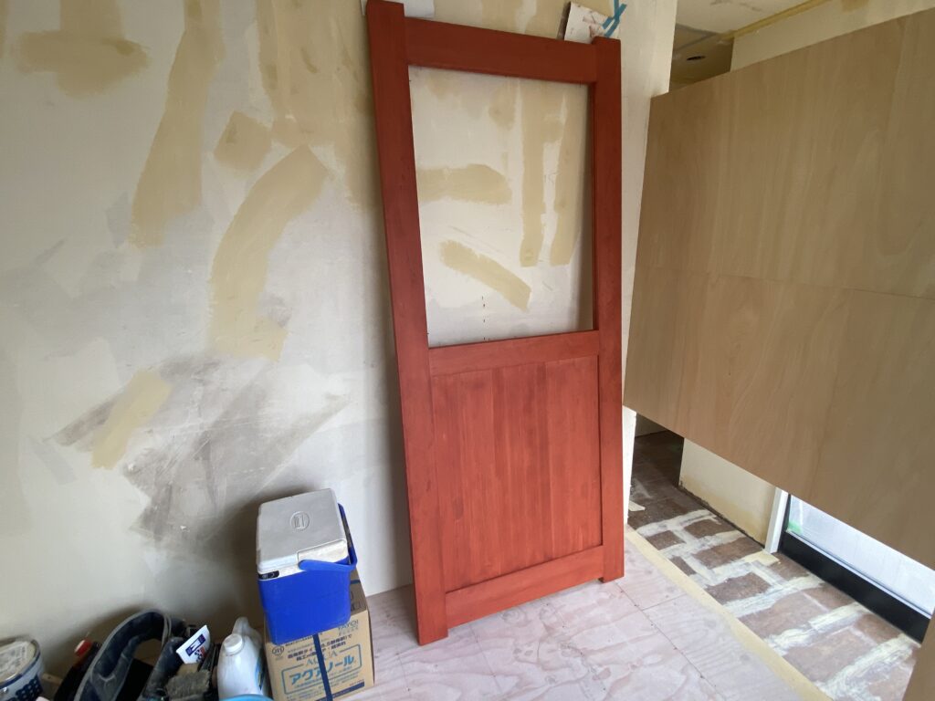 「扉は赤色にしたい!」というオーナー様のご要望にお応えして、木製の建具をべんがら色で塗装。