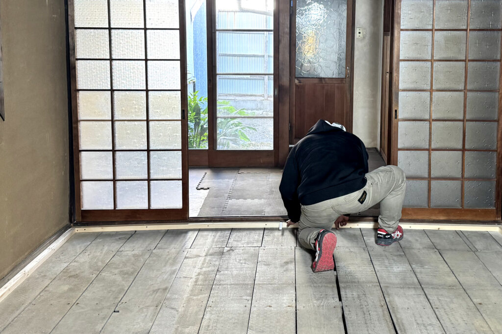 今回の現場で特徴的なのが、お客さん自身がDIYで仕上げを行う予定だという点です。奥のスペースでは、大工さんが床の下地工事を進めていますが、最終的な仕上げはお客さんが手を入れます。