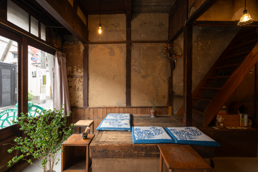 この空間づくりの軸は、「既存を壊すのではなく足していく」こと。町家の雰囲気をそのまま残しながら、モルタルの質感を加えることで、新旧の素材がつくるギャップを魅力として成立させています。