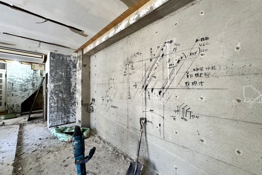 ……なんですが、それより先に目に入ったのが、床に残っていた“グラフィック”みたいな模様。現代アートっぽく見えるんですけど、よく見ると以前の工事の墨の跡なんですよね。こういうの、ちょっとテンション上がってしまいます。これがどう変わっていくのかは、またお楽しみに。
