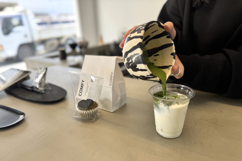 もちろん抹茶ラテを頼んだんですが、その場で抹茶を立ててもらって、ミルクにドリップ。これがめちゃくちゃおいしかったです。たぶんまた買うと思います。窓越しに見える現場の風景も、なかなか見ごたえがあるので、近くに来られたらちょっと覗いてみるのも楽しいかもしれません。
