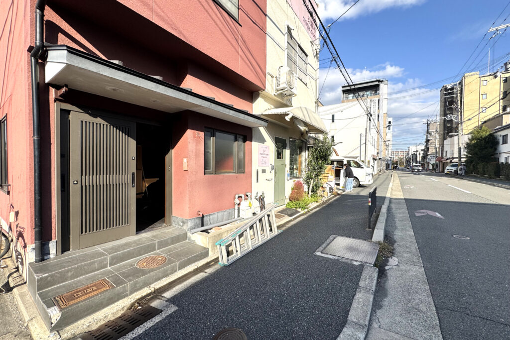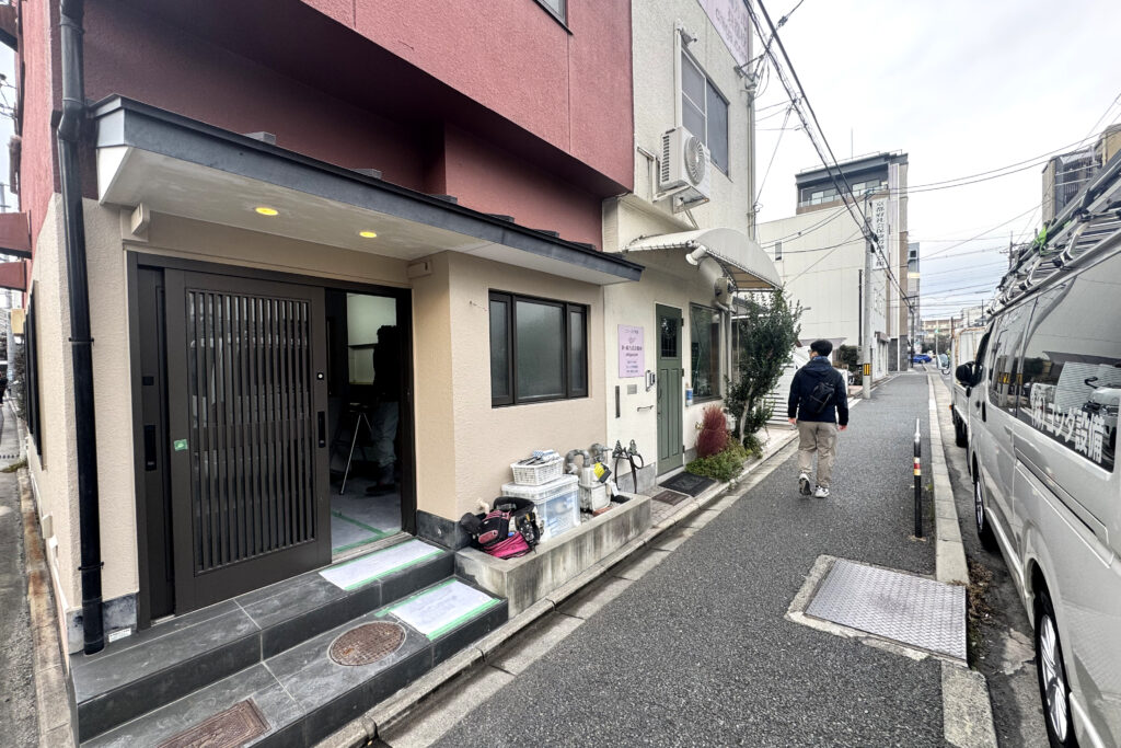 もともとはえんじ色の建物だったのですが、1階のみをアイボリーに塗り替えることで、ツートンのいい感じのファサードになっていました。2階まで塗り替えるとなると足場も必要で大変ですが、「1階だけを変える」という発想で印象をガラッと変えられる。これ、かなり良いアイディアだなと思います。ワクワクしながら入室しました。