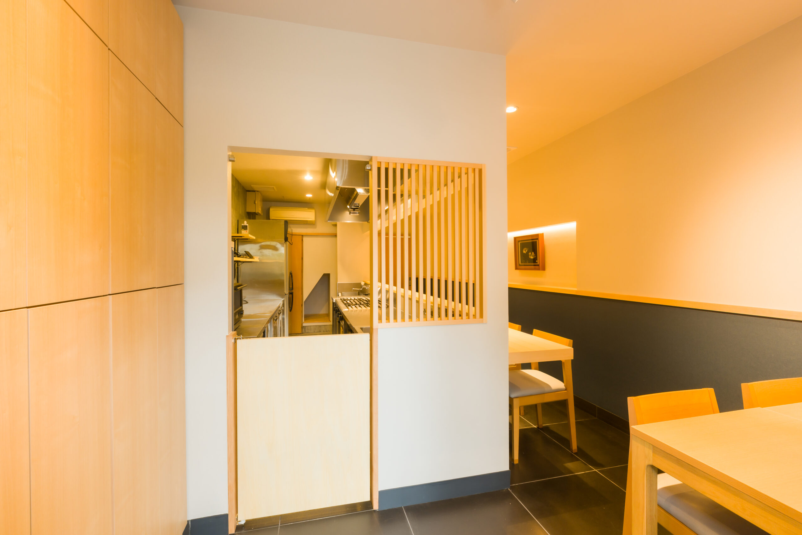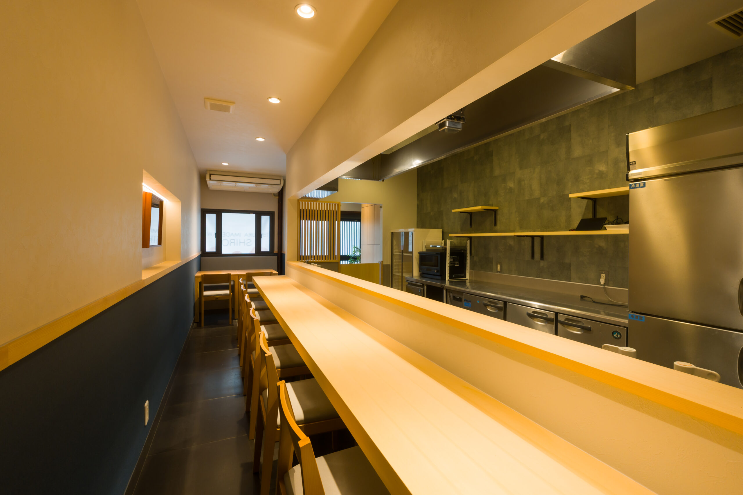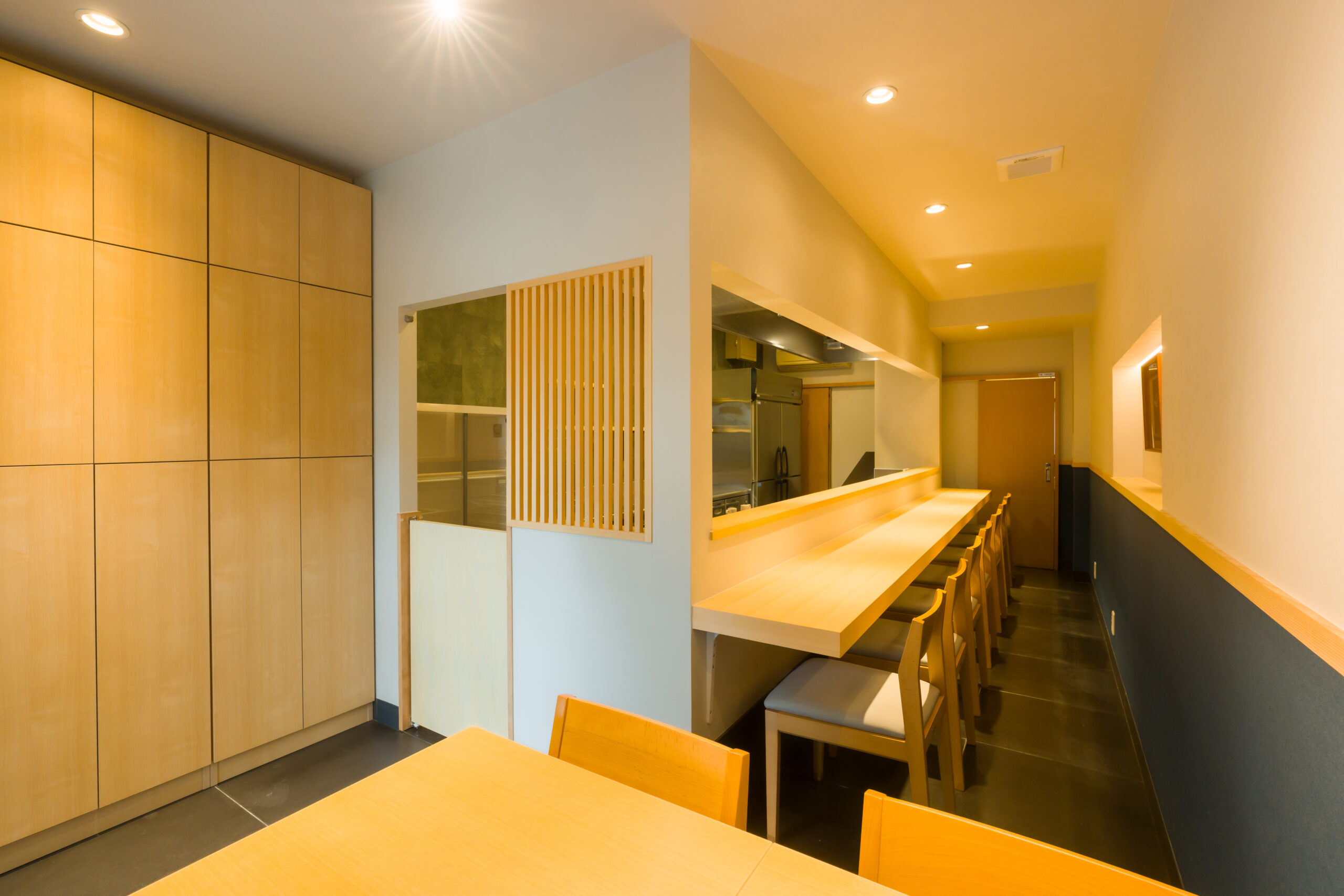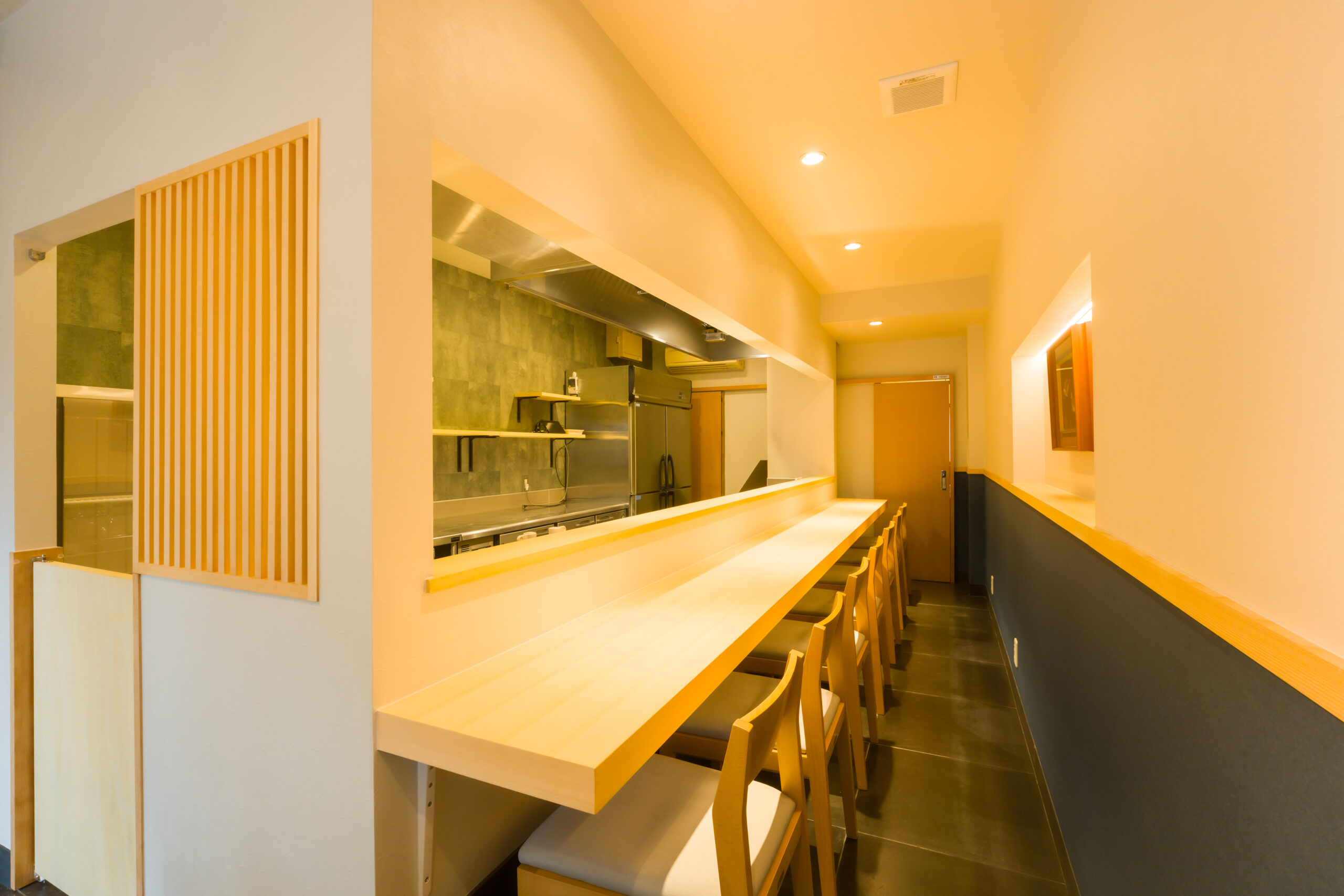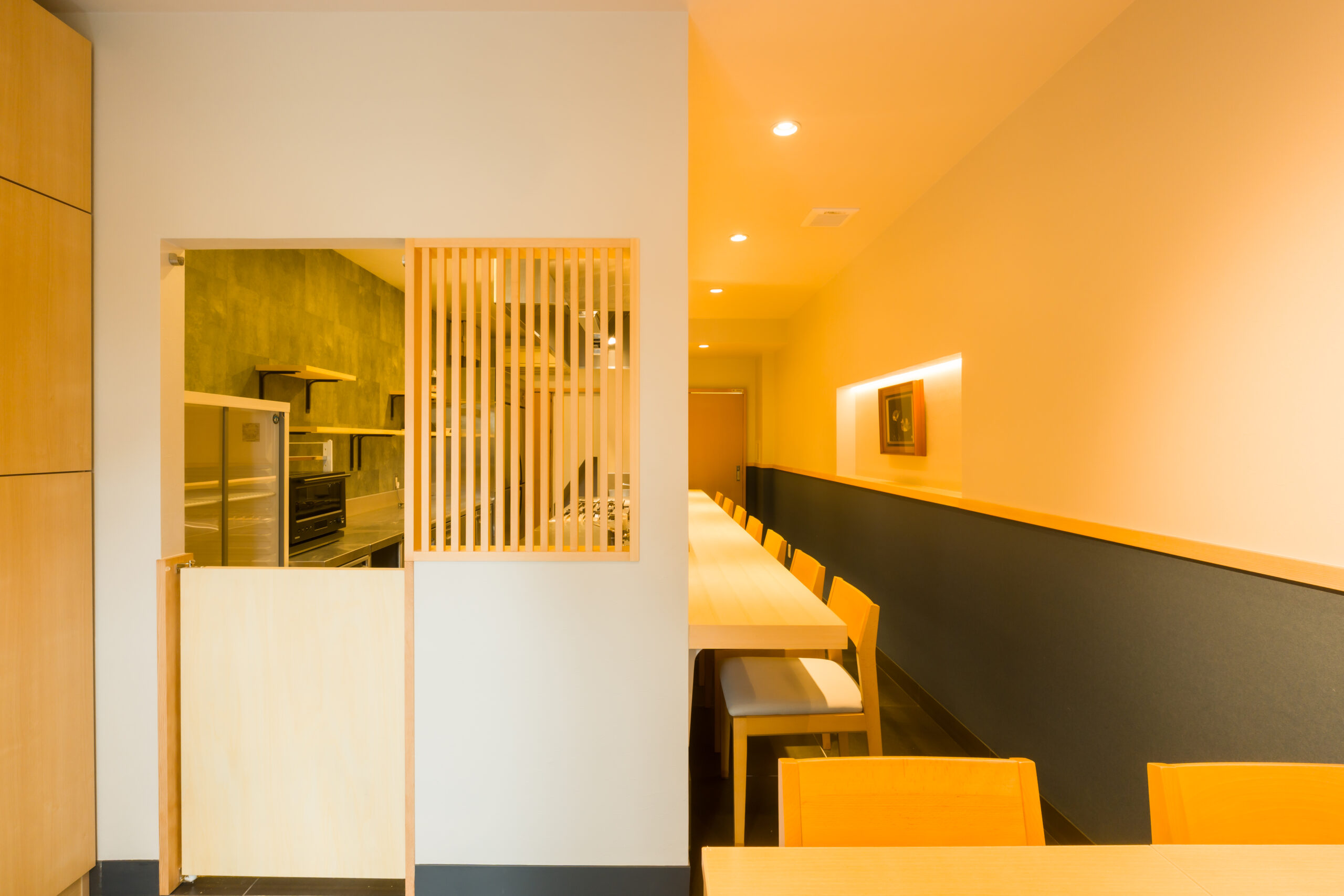 今出川エリアにて、天ぷらを中心とした和食店「天ぷら今出川しろ」様のオープンをお手伝いさせていただきました。飲食店跡の居抜き物件だったため、既存のレイアウトは活かしながら、クロスの張り替えや既存カウンターへの突板貼りなど、表装を中心とした改装によって空間の印象を整えていきました。外観は、もともと全面えんじ色だった建物に対し、1階部分のみ塗装を施すことで印象を変えることを目指しました。街並みに馴染みながらも、新しいお店がオープンしたことを自然に感じてもらえるような表情になったかと思います。ランチタイムは天丼や海鮮丼などの丼ものを中心に、ディナータイムには天ぷらと一品料理をお酒とともに楽しめる和食店として、色々な魅力を味わえるお店です。お近くの際はぜひお立ち寄りください。