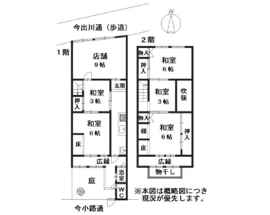京都市上京区東今小路町、北野天満宮や上七軒のほど近く。 今出川通りに面した2階建ての貸店舗です。 建物は昭和12年頃に建てられた木造の町家で、延床面積は約80.06m2(約24.2坪)。 間取りは5Kで、1階に約9帖の店舗スペースと和室、2階には6帖の和室が二間あり、吹き抜けを設けた開放的な造りです。 通り沿いの視認性に優れ、店舗やアトリエ、ギャラリーなどの用途にも適しています。 現況での引き渡しとなり、改装工事費や許認可の取得、近隣対策などは借主負担。 残置物の利用や撤去は相談のうえで決定となります。 火災保険への加入が必要で、保証会社の利用はオーナーとの相談に応じます。 賃料は月額20万円(税込・共益費込)、契約期間は3年で更新料は1ヶ月分。 西側区画も同時募集中のため、2戸一体での利用も可能です。 今出川通り沿いの風情ある町並みに立地し、北野天満宮・上七軒エリアへの導線上にある好立地。 町家の趣を生かしながら、自分らしい空間づくりを考える方におすすめの物件です。
