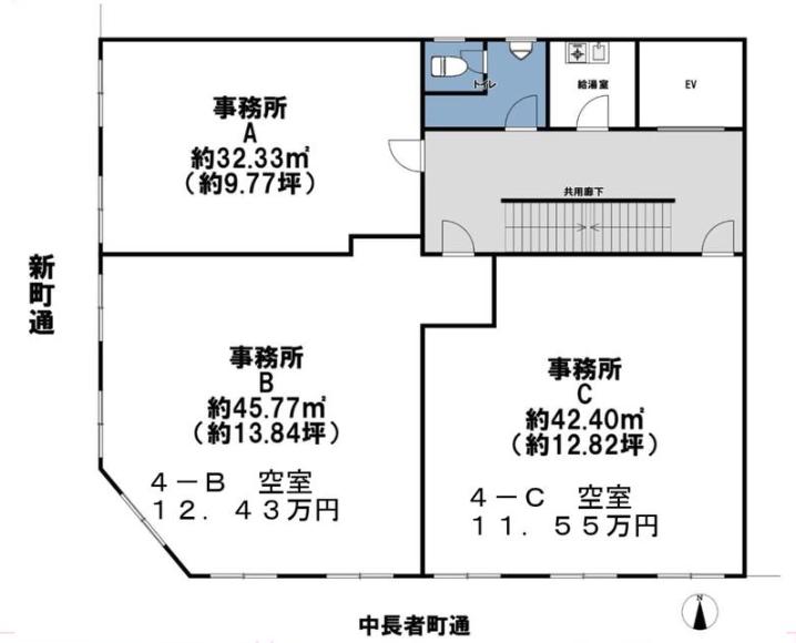 新町通りに面した角地に建つビルの4階、4-B区画のご紹介です。 地下鉄丸太町駅から徒歩11分、文化庁や官庁施設が集まる落ち着いたエリアに位置しています。 専有面積は約45.77m2(約13.84坪)。 ワンフロア内でも比較的ゆとりのある区画で、執務スペースと打ち合わせスペースを分けたレイアウトなども検討しやすい広さです。 角地立地のため、室内には自然光が入りやすく、日中の明るさを確保しやすい点も特徴のひとつ。 2020年には外壁塗装、2021年には共用部のリニューアルが行われており、建物全体としての印象も整っています。 事務所利用を中心に、静かな環境で業務を行いたい方に向いた区画です。 同フロア内の他区画との同時検討や一括利用についても相談可能ですので、使い方に合わせて柔軟にご検討いただけます。