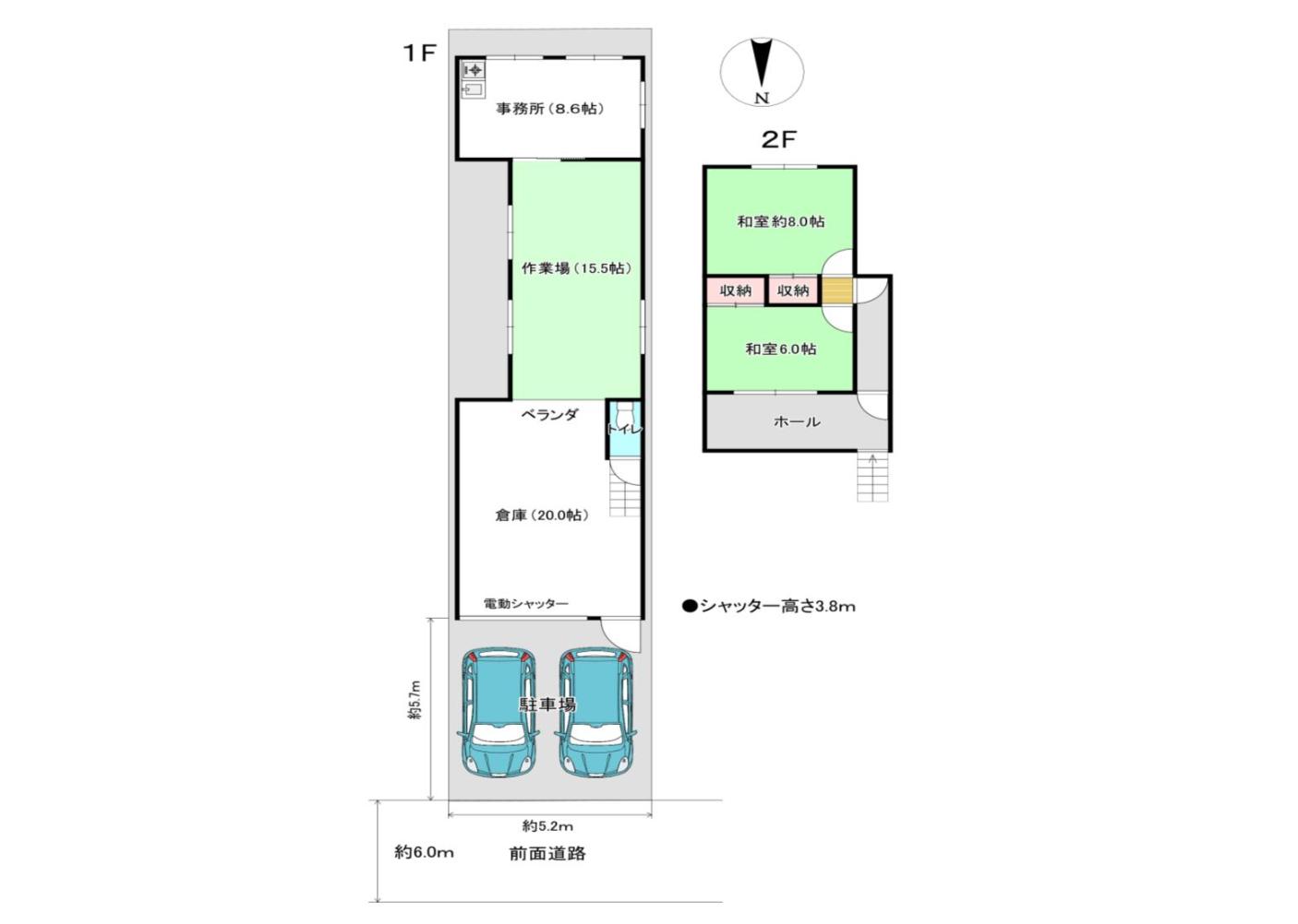 駐車場2台付き、路面から使える事務所兼倉庫