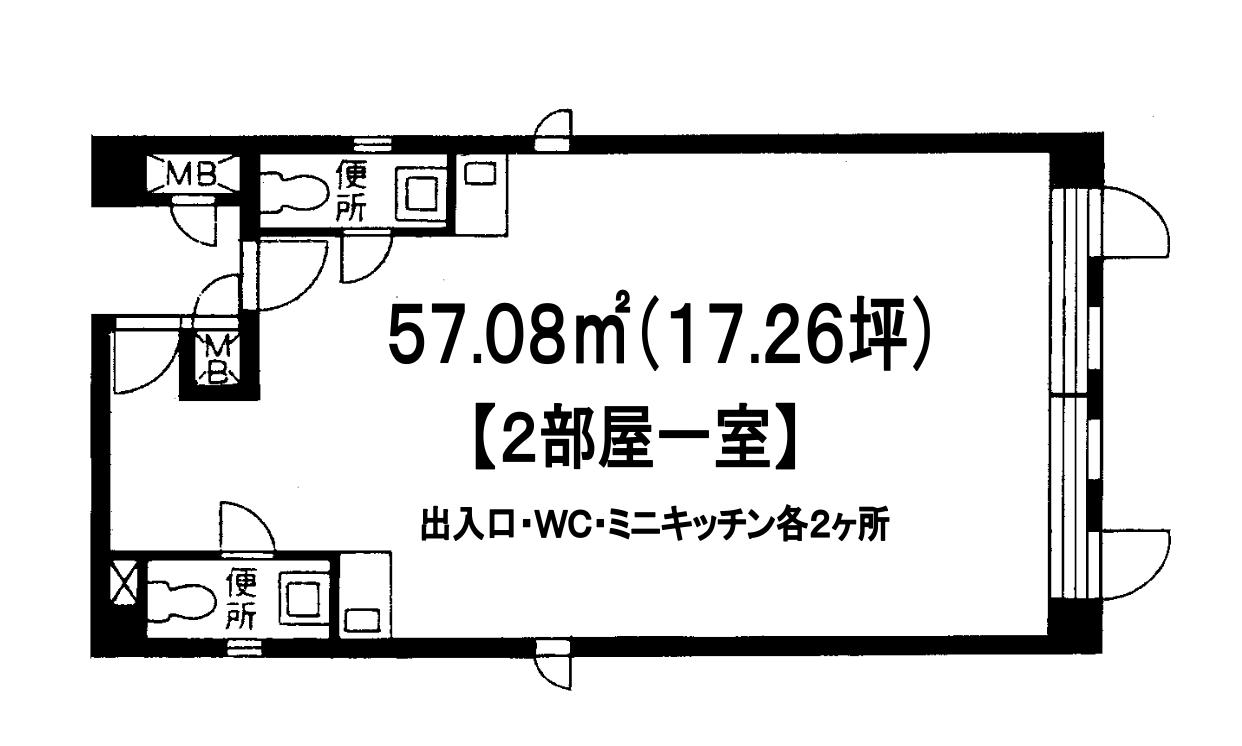 京都市中京区柳馬場通三条下る槌屋町に位置する京都 テナント・貸店舗。地下鉄「烏丸御池」駅から徒歩6分、「京都市役所前」駅から徒歩8分、阪急「烏丸」駅・「京都河原町」駅からも徒歩圏の場所にある建物2階区画です。面積は57.08m2で、坪換算では約17.26坪。RC造5階建の建物で、募集区画は2階東側部分となります。賃料は187,000円、共益費33,000円、保証金561,000円、礼金187,000円。契約期間は2年で更新料は不要とされています。現況は事務所仕様で、オール電化、各所にトイレとミニキッチンが設置されています。約17坪の広さがあり、事務所利用を中心にサービス用途なども使い方を検討しやすい規模です。区画を分けた使い方や用途に応じたレイアウト整理など、事業内容に合わせた運用を検討しやすい貸店舗です。